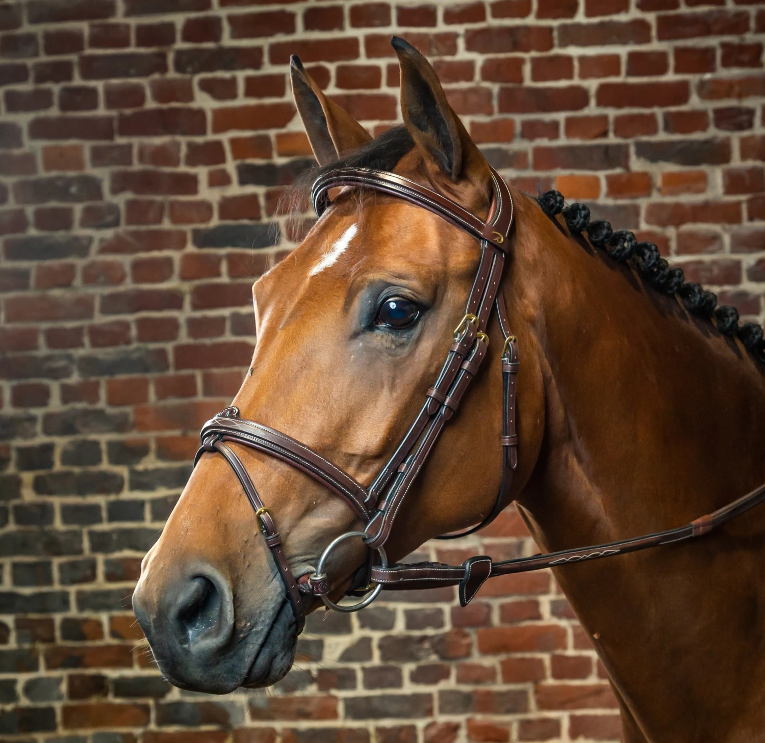 Dy’on collectie hoofdstel met gecombineerde neusriem is gemaakt van Engels leer en heeft een anatomisch S-vormig kopstuk. Voorzien van crèmekleurige sierstiksels op de front- en neusriem en koperkleurige gespen.