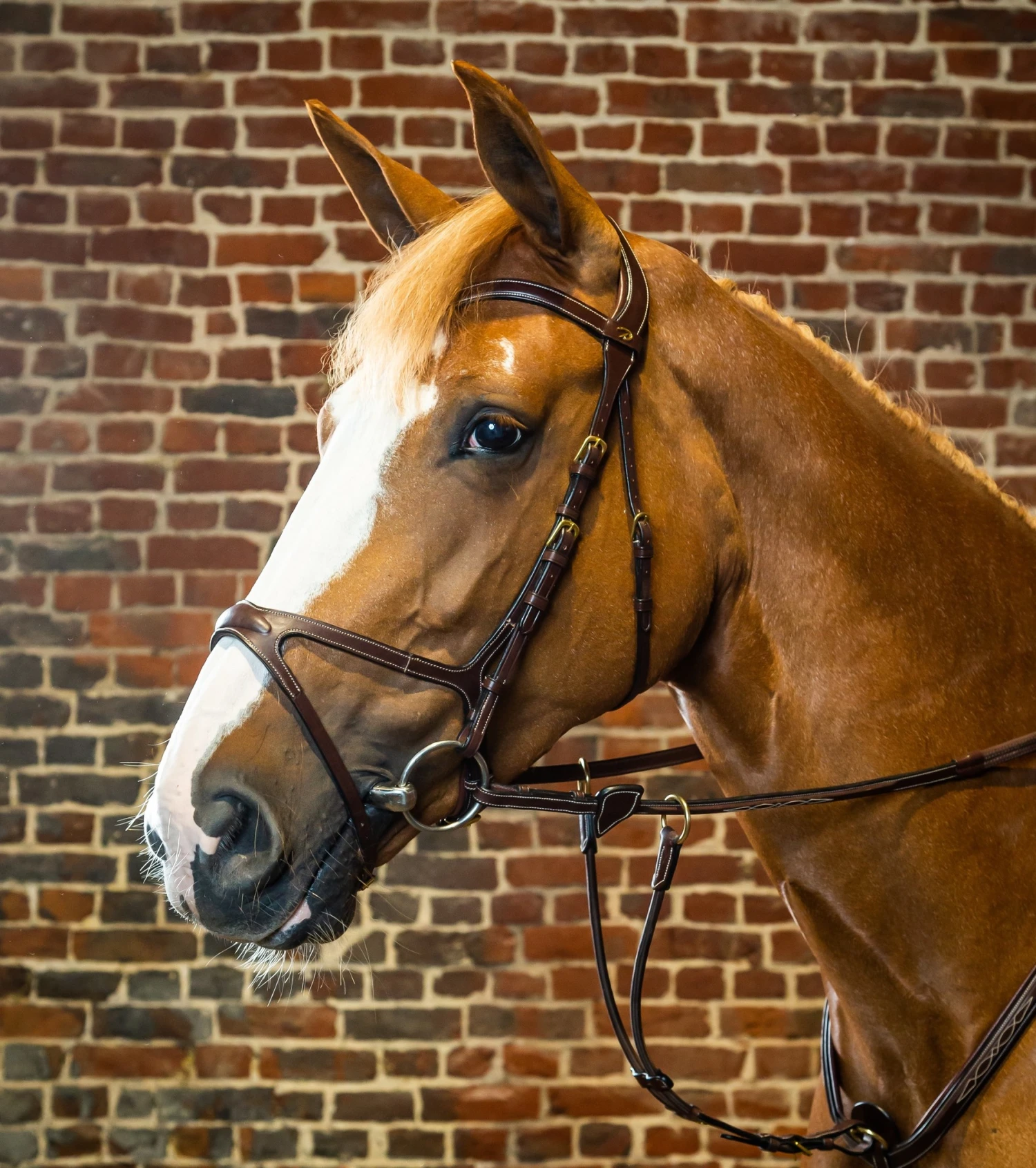 Dy’on collectie X-fit hoofdstel is gemaakt van Engels leer en heeft een anatomisch S-vormig kopstuk. De neusriem en bakstukken zijn gecombineerd aan één riempje met een vormgeving zodat de slaapbenen en jukbeenderen zoveel mogelijk vrij blijven van druk. De ergonomische neusriem vermindert de druk op de neusbrug en de zenuwen. Voorzien van crèmekleurige stiksels en koperkleurige gespen.