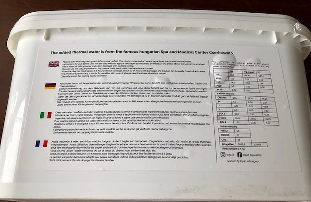 Equiq Spa klei met toegevoegd thermaal water afkomstig van het beroemde Hongaarse kuuroord en medisch centrum Cserkeszőlő. Equiq spa klei met langdurig ontstekingsremmend effect is samengesteld uit natuurlijke ingrediënten, kaolien en thermaal water, wat het bijzonder geschikt maakt voor paarden met een gevoelige huid. Je kunt de spa klei gebruiken op het paardenlichaam zoals op de rug of nek en benen.
