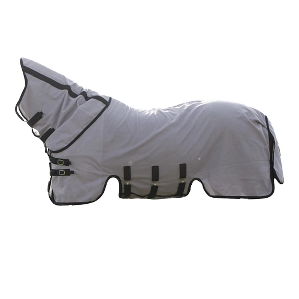 - De buik wordt beschermt door een brede buik flap die je met een klittenband en drie rechte buiksingels vastgemaakt. De flap zit dicht tegen het paard aan en voorkomt dat insecten in het deken kunnen vliegen.