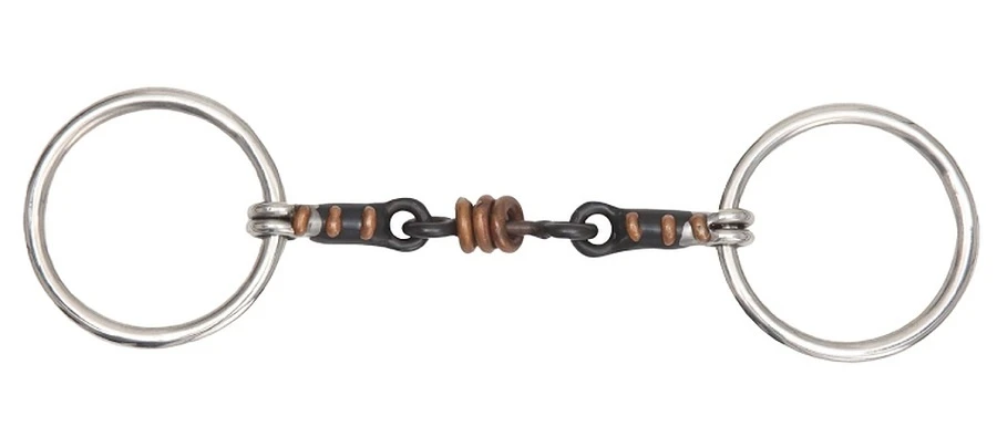 - Het midden stuk van dit bit is voorzien van koperen ringen die het paard aanmoedigen om met het bit te spelen waardoor de tongactiviteit wordt verhoogd.